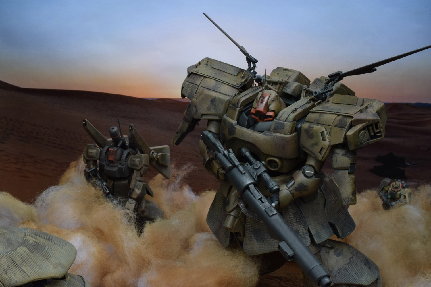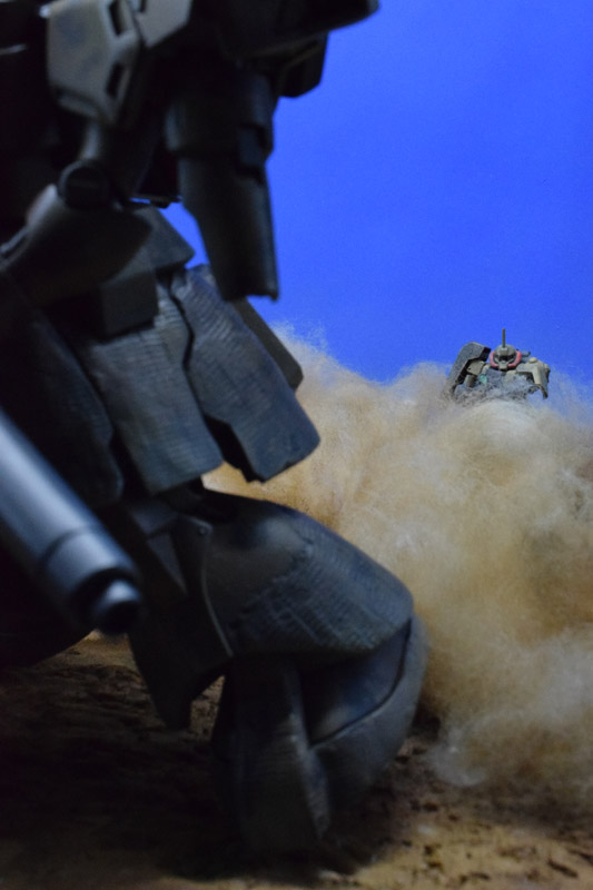 Il tutto per dare profondità ad una scena che cattura il diorama all’interno di una striscia in stile manga. In effetti i kit che si vedono sulla scena sono 4 ( tra cui un MG 1/100 e non 3 … Provate a trovare l’intruso…